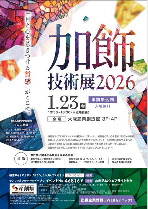 来る1月23日、大阪産業創造館で開催されます【加飾技術展2026】展示会におきましても、弊社ブースを出展する運びとなりました。